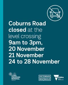 Following this there will be Co burns Road closures between Staughton St and James Melrose Drive from 9am to 3pm on 20 and 21 November and between 24 and 28 November for concrete pours.