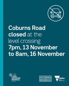 Following this there will be Co burns Road closures between Staughton St and James Melrose Drive from 9am to 3pm on 20 and 21 November and between 24 and 28 November for concrete pours.